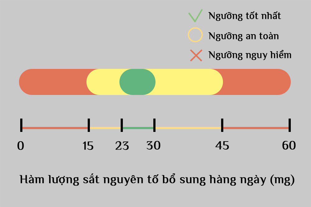 Trong khi đó, chế độ dinh dưỡng hằng ngày chỉ có thể đáp ứng một phần nhỏ nhu cầu sắt của thai kỳ. Do đó, các bác sĩ thường khuyên mẹ bầu nên bổ sung thêm viên uống sắt với hàm lượng khoảng 23~30mg/ngày